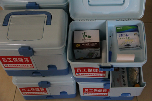 為方便職工在工作中遇到意外傷害時能夠得到及時的處置,保障職工健康,公司工會在保健箱里配備了血壓計、體溫計、碘伏、創(chuàng)可貼、醫(yī)用紗布、棉簽等物品。針對心臟病患者還特別配備了速效救心丸以解燃眉之急。
