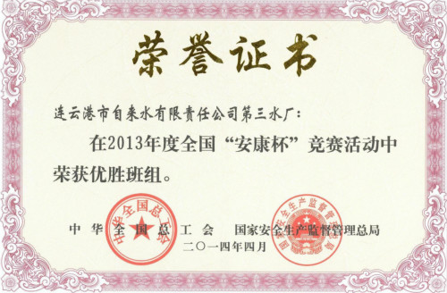 近日,從中華全國總工會、國家安全生產(chǎn)監(jiān)督管理總局傳來喜訊,公司第三水廠獲2013年度全國“安康杯”競賽優(yōu)勝班組榮譽(yù)稱號。