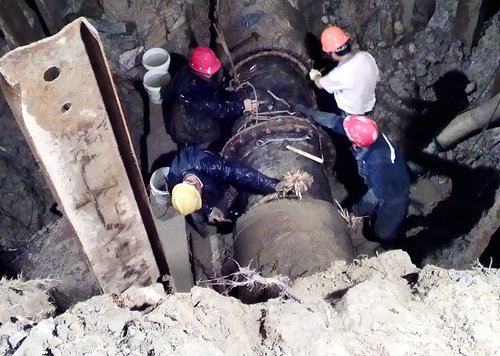 22日深夜,連云區(qū)港城大道附近一處DN500的管線發(fā)生爆裂,接到報修后,公司相關(guān)部室、單位迅速采取緊急處理措施,水廠降壓、停止部分區(qū)域供水等,并組織相關(guān)施工人員趕到事故現(xiàn)場。從22日深夜零點到24日凌晨4點,公司的搶修人員晝夜不息,冒雨施工!在深5米的管溝內(nèi)搶修管道時,因為雨量大,曾出現(xiàn)塌方,搶修人員及時避讓,未出現(xiàn)人員受傷情況,隨后,現(xiàn)場負責(zé)人馬上采取用鋼板在周邊固定等方式,避免再次出現(xiàn)塌方!搶修人員加班加點,冒雨不間斷搶修,終于在凌晨3點恢復(fù)供水,4點半完成施工現(xiàn)場恢復(fù)等后續(xù)工作。搶修比預(yù)計時間提前三小時完成,有效降低了公司的產(chǎn)銷差。
