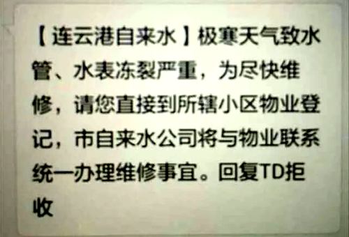 2016年1月22日至25日的強冷空氣,導(dǎo)致港城多地日最低氣溫降至零下15攝氏度,打破45年來的紀錄。寒流來襲前,我公司提前部署防寒預(yù)案,取消全員休假,并利用報紙、電視、連網(wǎng)(連云港發(fā)布)微信等多種媒體宣傳防寒知識和應(yīng)急解凍辦法,印刷1萬份防寒小宣傳冊發(fā)到市區(qū)所有小區(qū),在各小區(qū)及社區(qū)張貼防寒通知,向用戶發(fā)送防寒短信20萬條。