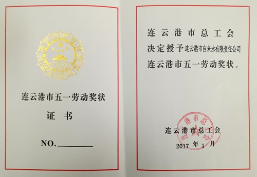 近日,從市總工會傳來喜訊,連云港市自來水有限責任公司榮獲“連云港市五一勞動獎狀”。