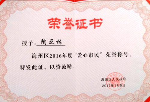 年度“愛(ài)心市民”榮譽(yù)稱號(hào)。