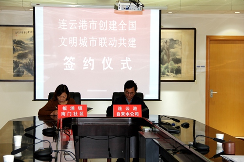 為進(jìn)一步推動(dòng)我市創(chuàng)建全國(guó)文明城市工作深入開展,加強(qiáng)上下聯(lián)動(dòng),形成整體合力,中共連云港市委辦公室和連云港市人民政府辦公室聯(lián)合下發(fā)《連云港市創(chuàng)建全國(guó)文明城市聯(lián)動(dòng)共建實(shí)施意見》,將我公司與海州區(qū)板浦鎮(zhèn)南門社區(qū)結(jié)成共創(chuàng)全國(guó)文明城市對(duì)子。經(jīng)公司多次赴南門社區(qū)調(diào)研并與南門社區(qū)協(xié)商,征求社區(qū)意見,確定南門社區(qū)急需解決的問題,共同商定公司為南門社區(qū)鋪設(shè)板浦鎮(zhèn)南門社區(qū)東圩邊小街巷工程,以努力推動(dòng)文明城市創(chuàng)建工作廣泛深入開展。2017年9月29日,根據(jù)兩辦《聯(lián)動(dòng)共建實(shí)施意見要求》,雙方在連云港自來水公司簽訂了《連云港市創(chuàng)建全國(guó)文明城市聯(lián)動(dòng)共建協(xié)議》。