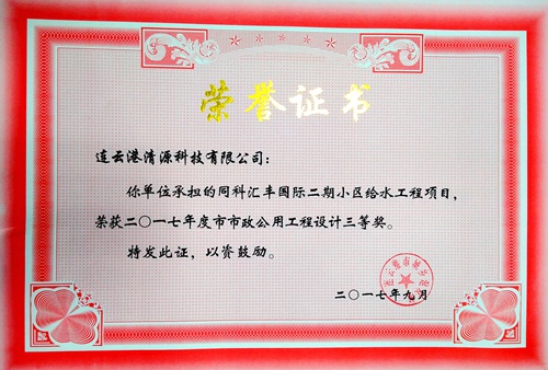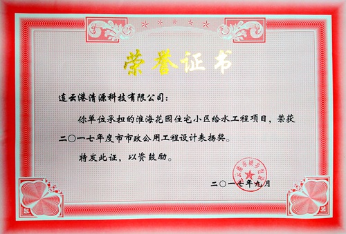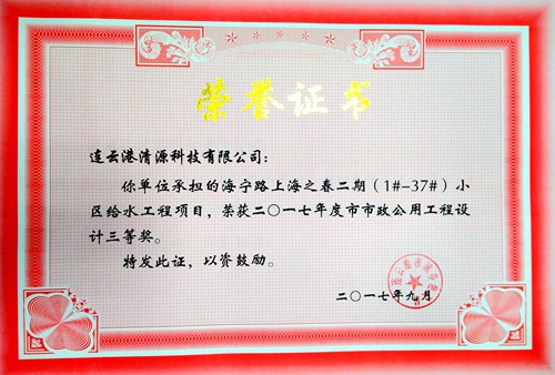 在本年度連云港市城鄉(xiāng)建設(shè)局組織的“2017年度連云港市城鄉(xiāng)建設(shè)系統(tǒng)優(yōu)秀勘察設(shè)計(jì)評(píng)選”活動(dòng)中,由公司技術(shù)部設(shè)計(jì)的多個(gè)給水工程項(xiàng)目通過專家組評(píng)選,榮獲市政公用工程優(yōu)秀設(shè)計(jì)三等獎(jiǎng)3項(xiàng),市表揚(yáng)獎(jiǎng)1項(xiàng),獲獎(jiǎng)項(xiàng)目主要設(shè)計(jì)人員有:徐艷玲、史俊陽、吳敏、臧玉強(qiáng)、童心、趙海云、楊雪等。