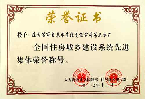 2017年12月14日,中華人民共和國人力資源社會保障部、住房城鄉(xiāng)建設部印發(fā)《關于表彰全國住房城鄉(xiāng)建設系統(tǒng)先進集體 先進工作者和勞動模范的決定》(人社部發(fā)〔2017〕93號),連云港自來水公司第三水廠喜獲“全國住房城鄉(xiāng)建設系統(tǒng)先進集體”榮譽稱號,這是第三水廠繼榮獲“全國安康杯競賽優(yōu)勝單位”后獲得的又一殊榮。此次江蘇省榮獲“全國住房城鄉(xiāng)建設系統(tǒng)先進集體”榮譽的共有十四家單位或集體,連云港市僅有連云港自來水公司第三水廠一家獲此殊榮。