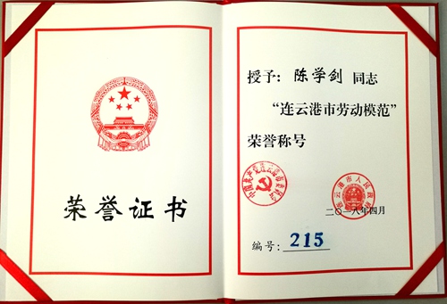 近日,連云港市召開勞模表彰大會,我公司陳學(xué)劍同志榮獲2015—2017年度連云港市勞動模范稱號。