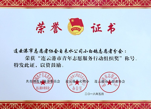 2018年4月,共青團連云港市委、市文明辦、市志愿者協(xié)會聯(lián)合開展了2017年度全市青年志愿者行動評選表彰活動。經(jīng)評審委員會資格審查、組織評選等程序,從組織開展志愿服務活動成效、組織的管理和運行、使用志愿者打卡器開展活動等方面綜合評選,公司“小白鴿志愿者分會”榮獲“連云港市青年志愿服務行動組織獎”稱號。
