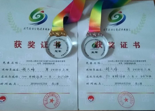 近日,從連云港市全民健身運動會傳來喜訊,公司趙義峰同志獲得2018連云港市首屆全民健身運動會游泳比賽暨市第三屆游泳錦標(biāo)賽100米蛙泳第一名、50米蛙泳第二名。