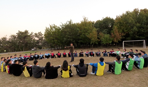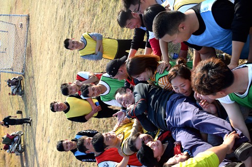 早上9點(diǎn),在青松嶺寬闊的草坪上拓展培訓(xùn)正式拉開序幕。開班前,青年學(xué)員們在教練的帶領(lǐng)下進(jìn)行了一系列的歡快活動(dòng),旨在建立彼此信任的基礎(chǔ)上營造團(tuán)隊(duì)快樂和諧的氛圍。而后,學(xué)員分為四個(gè)隊(duì),按照教練所提要求,各隊(duì)分別設(shè)計(jì)自己隊(duì)的隊(duì)名、隊(duì)訓(xùn)、隊(duì)徽、隊(duì)歌等。