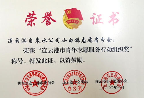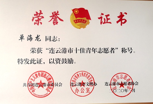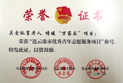 近日,團(tuán)市委、市文明辦、市志愿者協(xié)會(huì)聯(lián)合下發(fā)了《關(guān)于表彰2019年度優(yōu)秀青年志愿者、志愿服務(wù)項(xiàng)目、志愿服務(wù)行動(dòng)組織獎(jiǎng)的決定》,公司“關(guān)愛(ài)孤寡老人 情暖萬(wàn)家樂(lè)”項(xiàng)目榮獲“連云港市優(yōu)秀青年志愿服務(wù)項(xiàng)目”;小白鴿志愿者分會(huì)獲“連云港市青年志愿服務(wù)行動(dòng)組織獎(jiǎng)”;公司青年志愿者單海龍獲“連云港市十佳志愿者”稱(chēng)號(hào)。